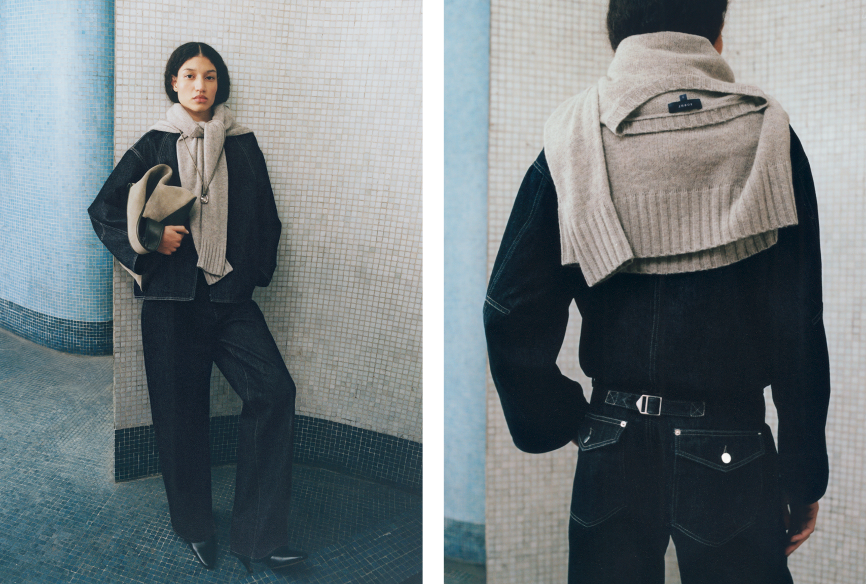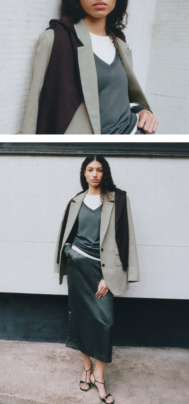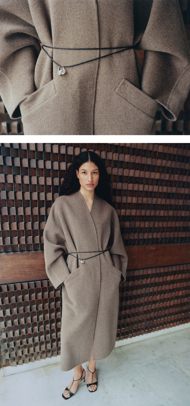 A palette of white, beige and chalk tones shapes an urban and feminine wardrobe. Materials are layered and combined with understated elegance: double-face heathered wool, supple leather, poplin and textured denim.