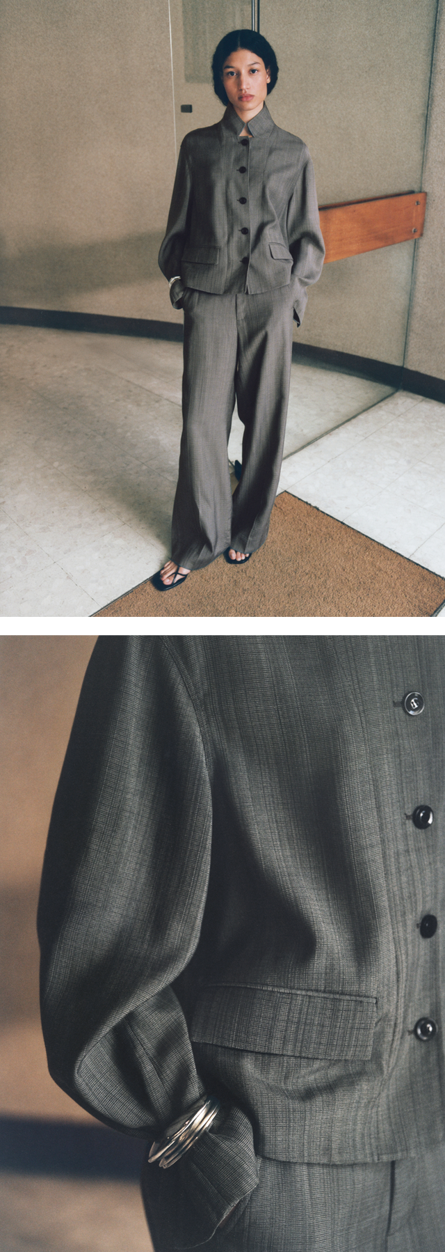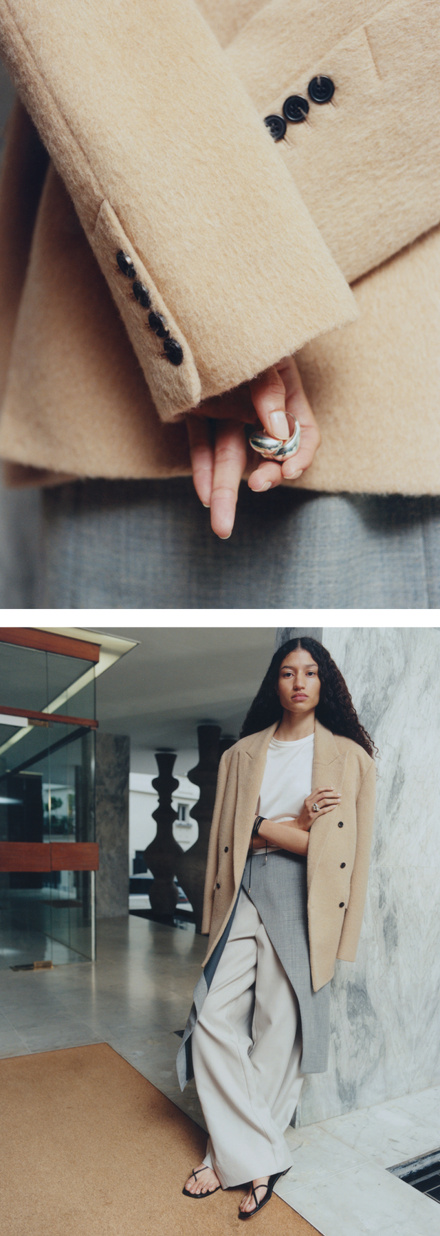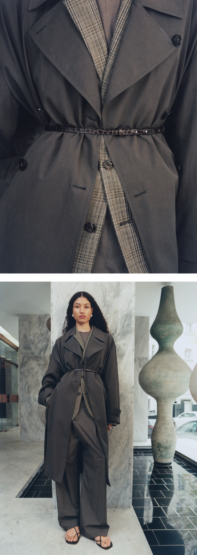 A palette of white, beige and chalk tones shapes an urban and feminine wardrobe. Materials are layered and combined with understated elegance: double-face heathered wool, supple leather, poplin and textured denim.