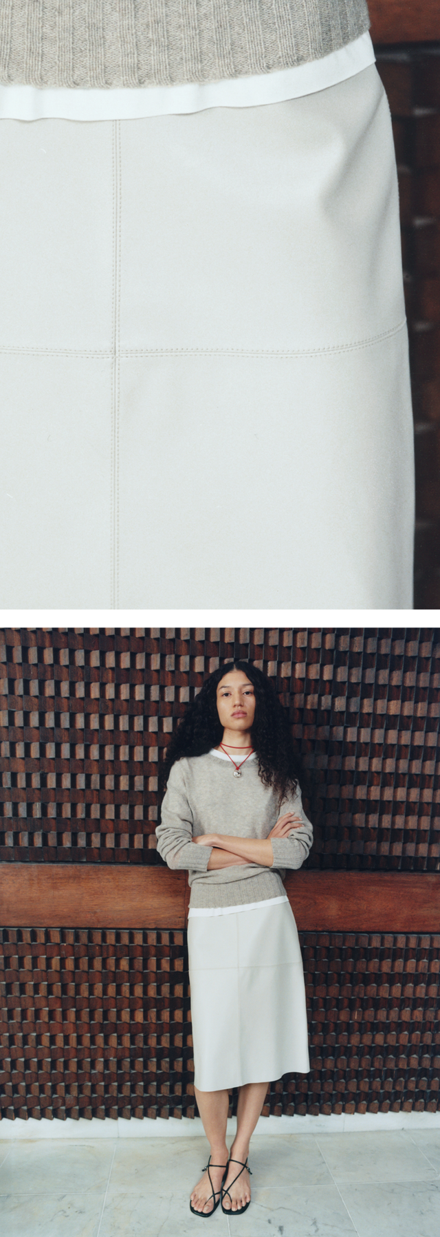 An interplay of jewellery and colourful cords completes the look, while the new sandals hint at the summer styles to come.