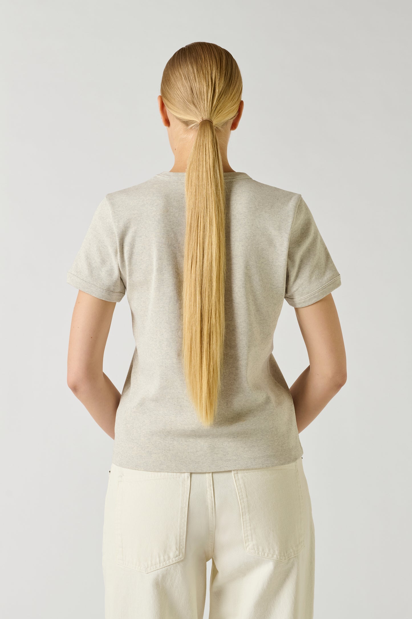 ARISTIDE is a T-shirt in organic cotton knitted in extra-fine ribbing. The thick ribs accentuate the neckline and the short, round sleeves, enhancing its close-fitting silhouette. Our "Soeur" logo is embroidered in the centre front with a tone-on-tone thread.